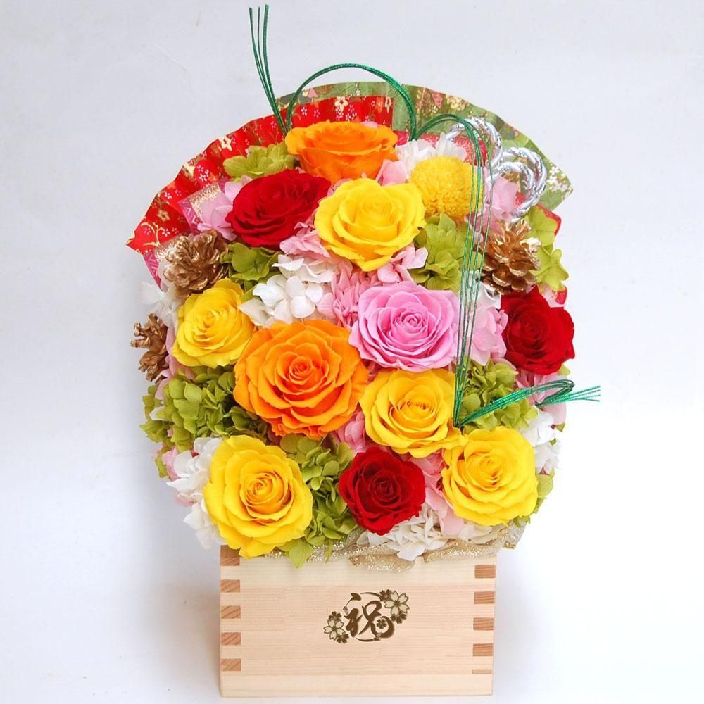 開店・開業祝い、周年記念のお祝い、ご移転祝いのプレゼントに!縁起の良い枡の器に、雅な色合いのプリザーブドフラワーが咲き続けます。