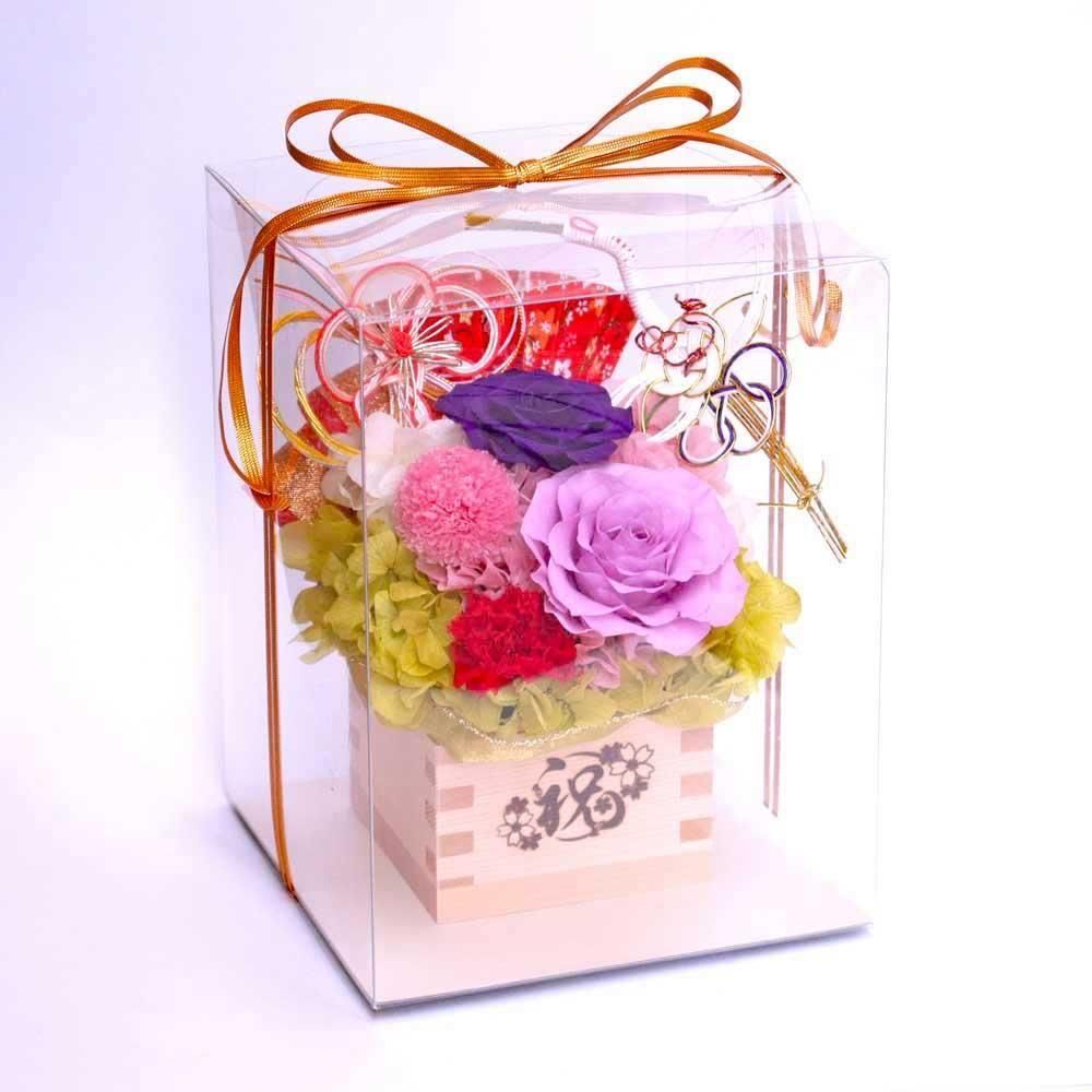 枡フラワーの雰囲気に似合う和風のリボンとクリアケースでラッピングいたします。(無料)