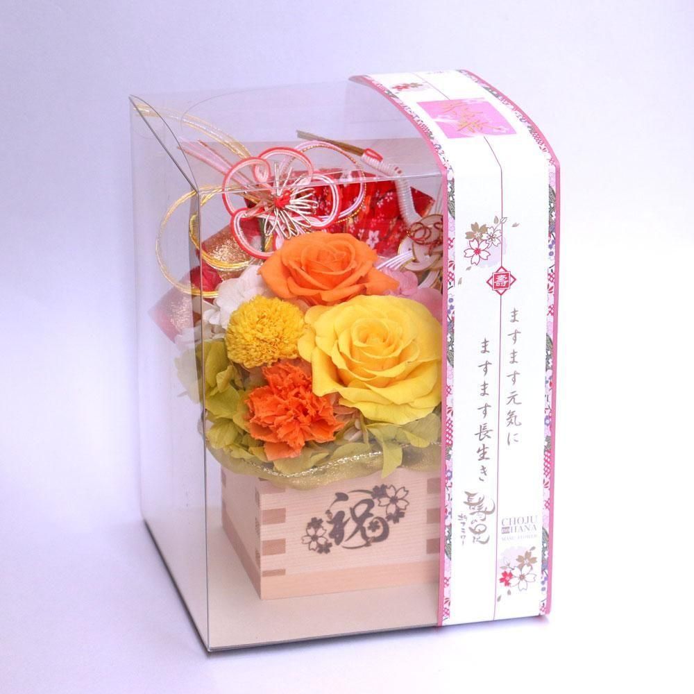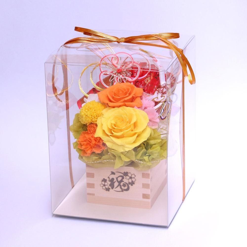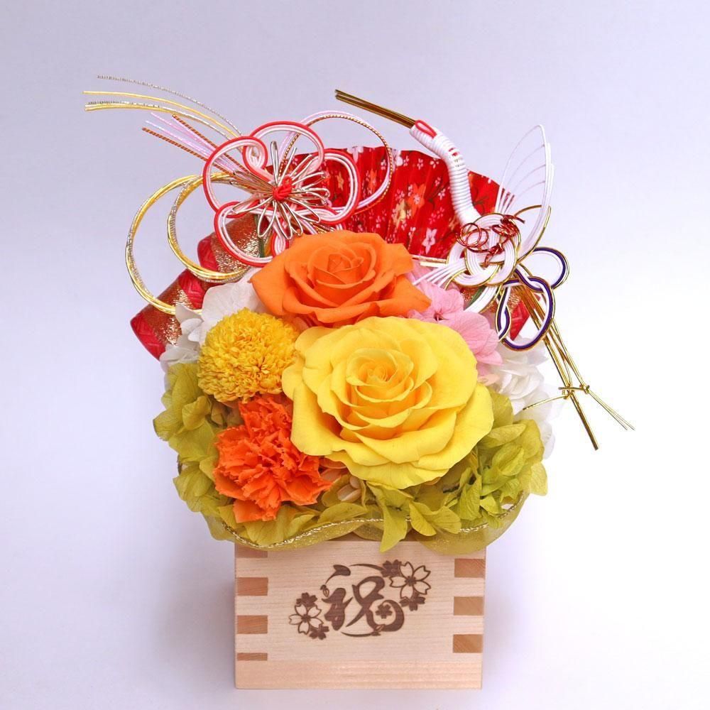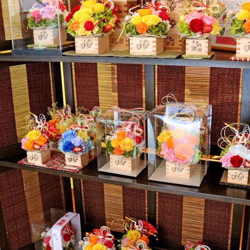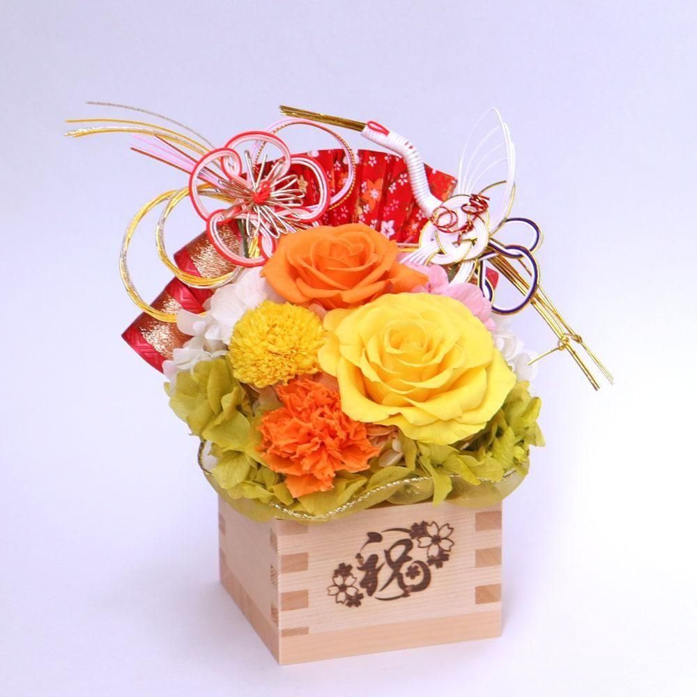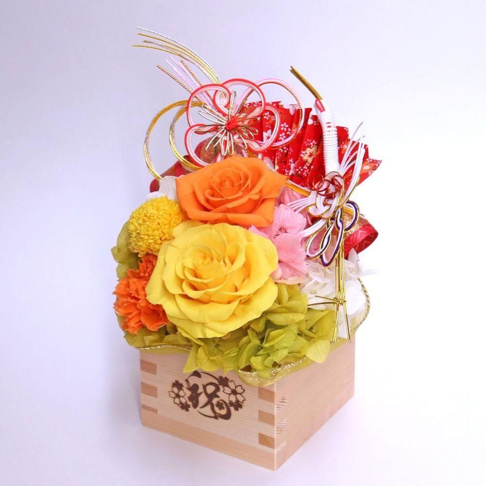 縁起の良い枡の器にプリザーブドフラワーが咲き続けます。
