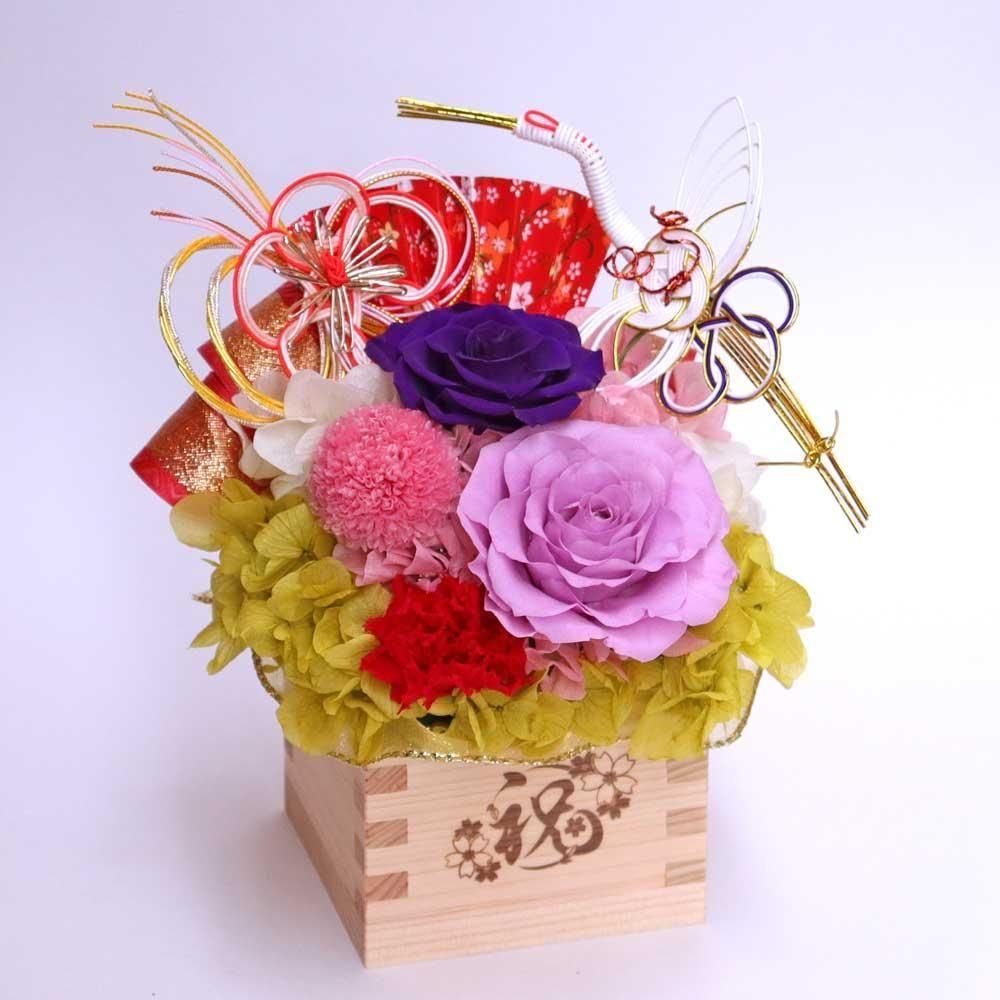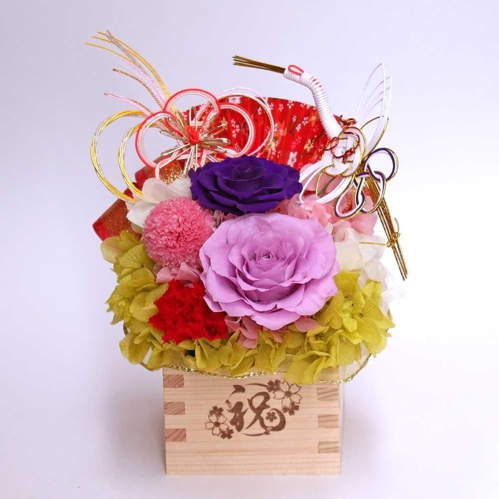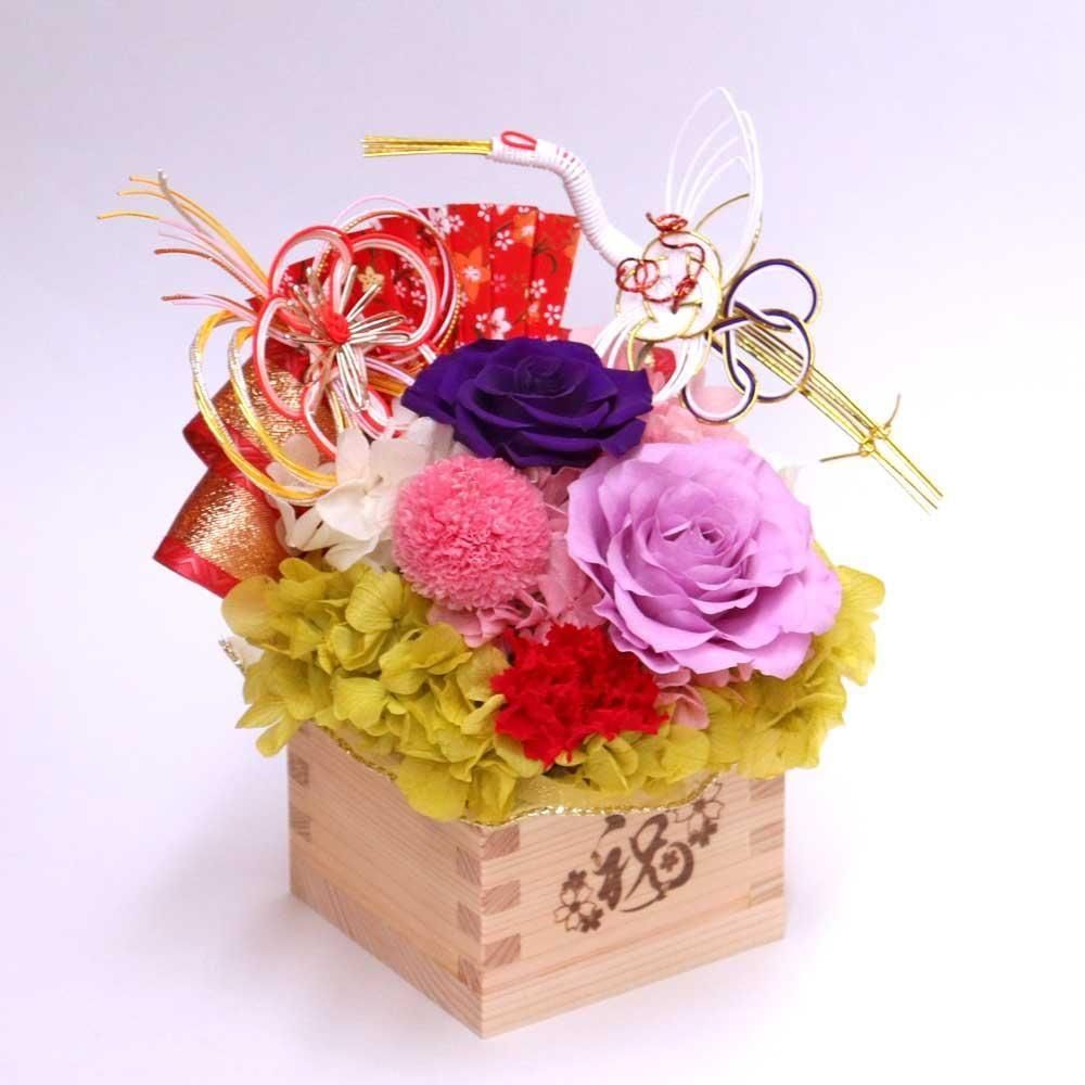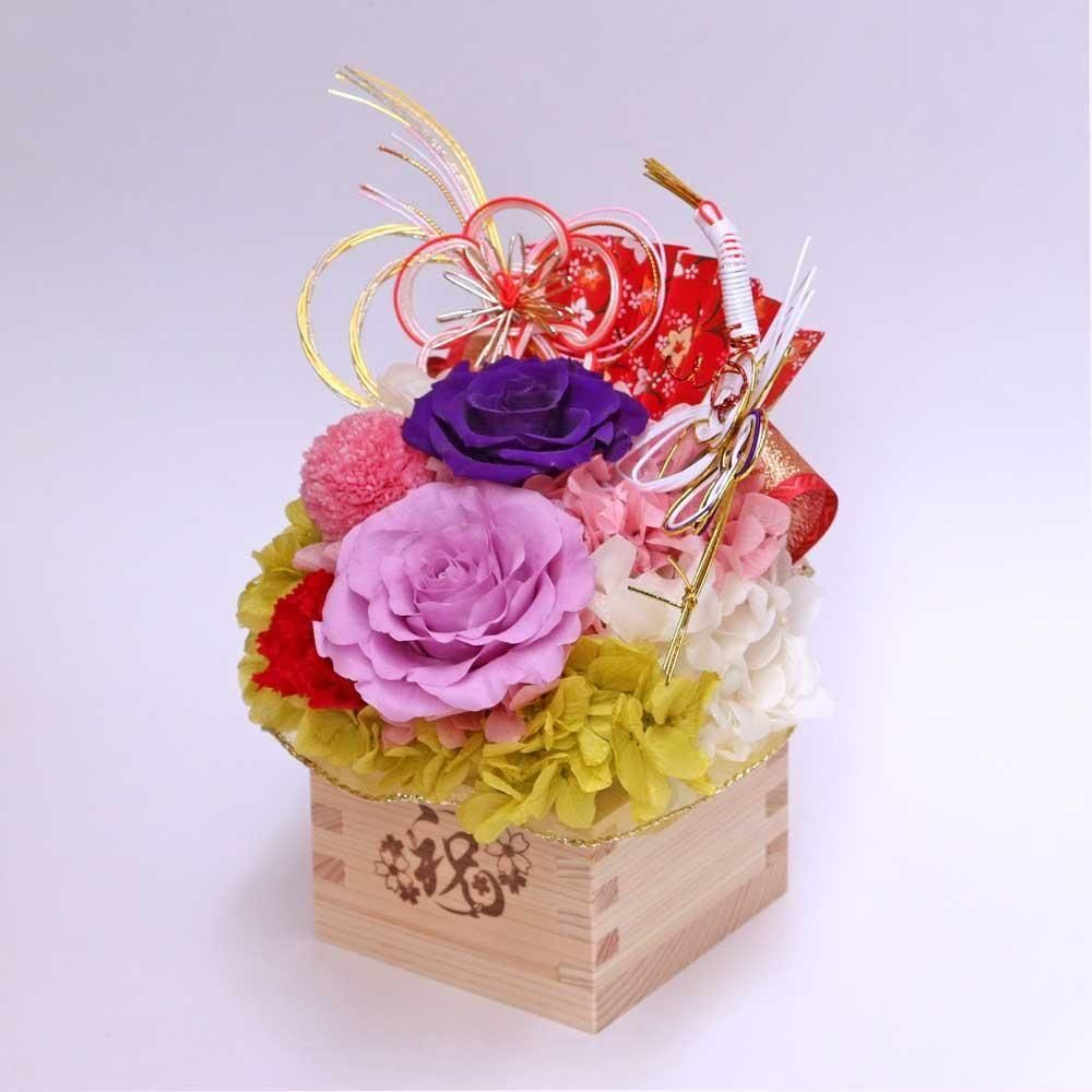 縁起の良い枡の器にプリザーブドフラワーが咲き続けます。