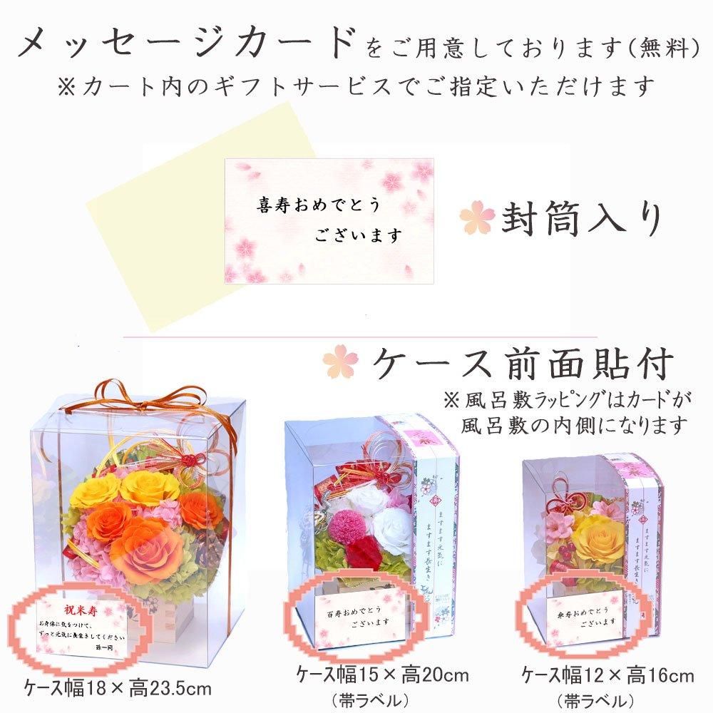 クリアケース入りのお花を、桃色の風呂敷(不織布製)と、長寿の花帯ラベル、金色の紐リボンでラッピングいたします。(+330円)