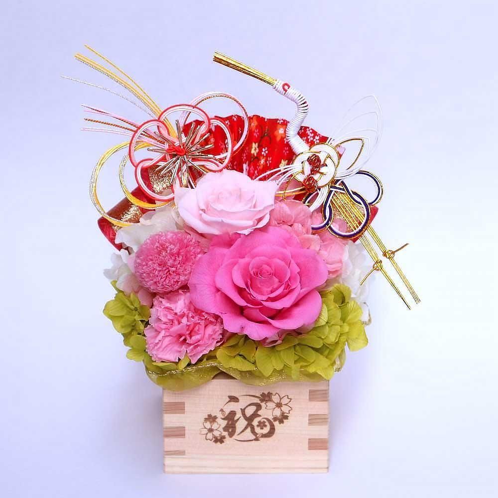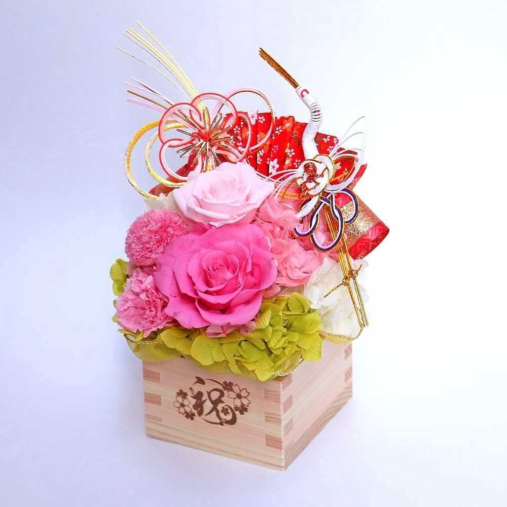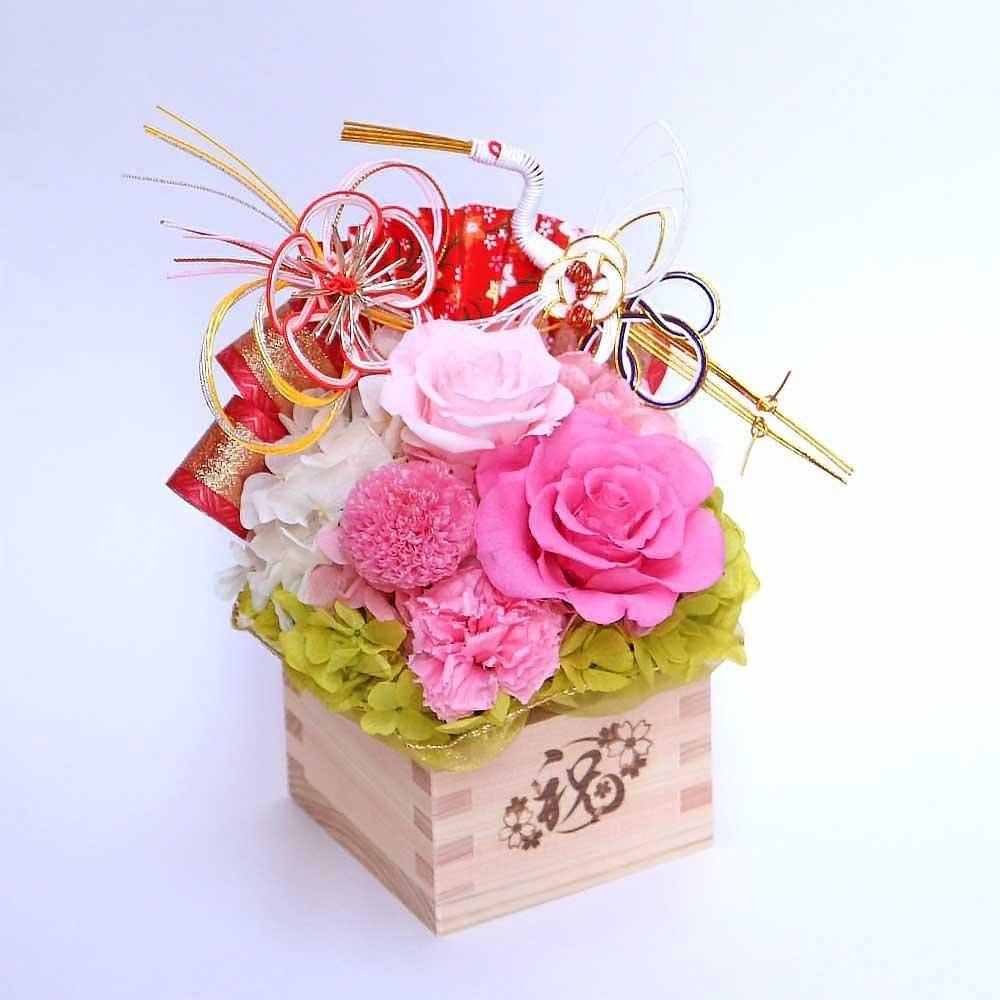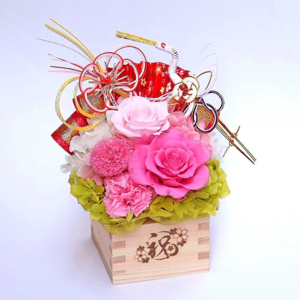 開店・開業祝い、周年記念のお祝い、ご移転祝いのプレゼントに! 縁起の良い枡の器に、雅な色合いのプリザーブドフラワーが咲き続けます。