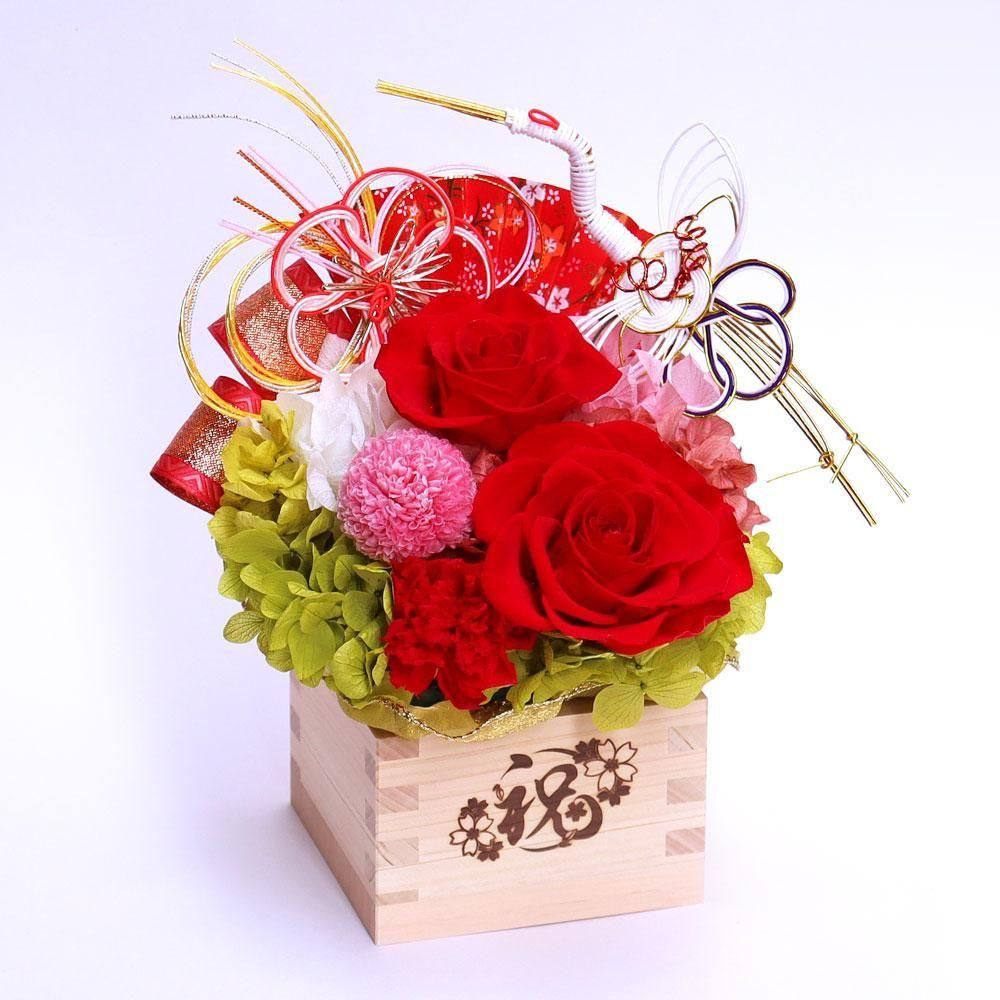 一合枡のお花「祥福(しょうふく、赤色)」は、赤色の薔薇やカーネーション、赤紫色の丸いポンポンマム(菊)のプリザーブドフラワーが明るい彩りの枡フラワーです。