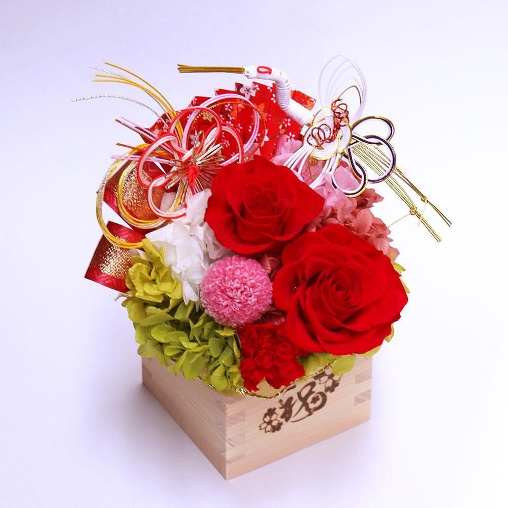 主な花材:薔薇、ポンポンマム、カーネーション、アジサイ(以上、プリザーブドフラワー)、水引、リボン、ヒノキの枡
