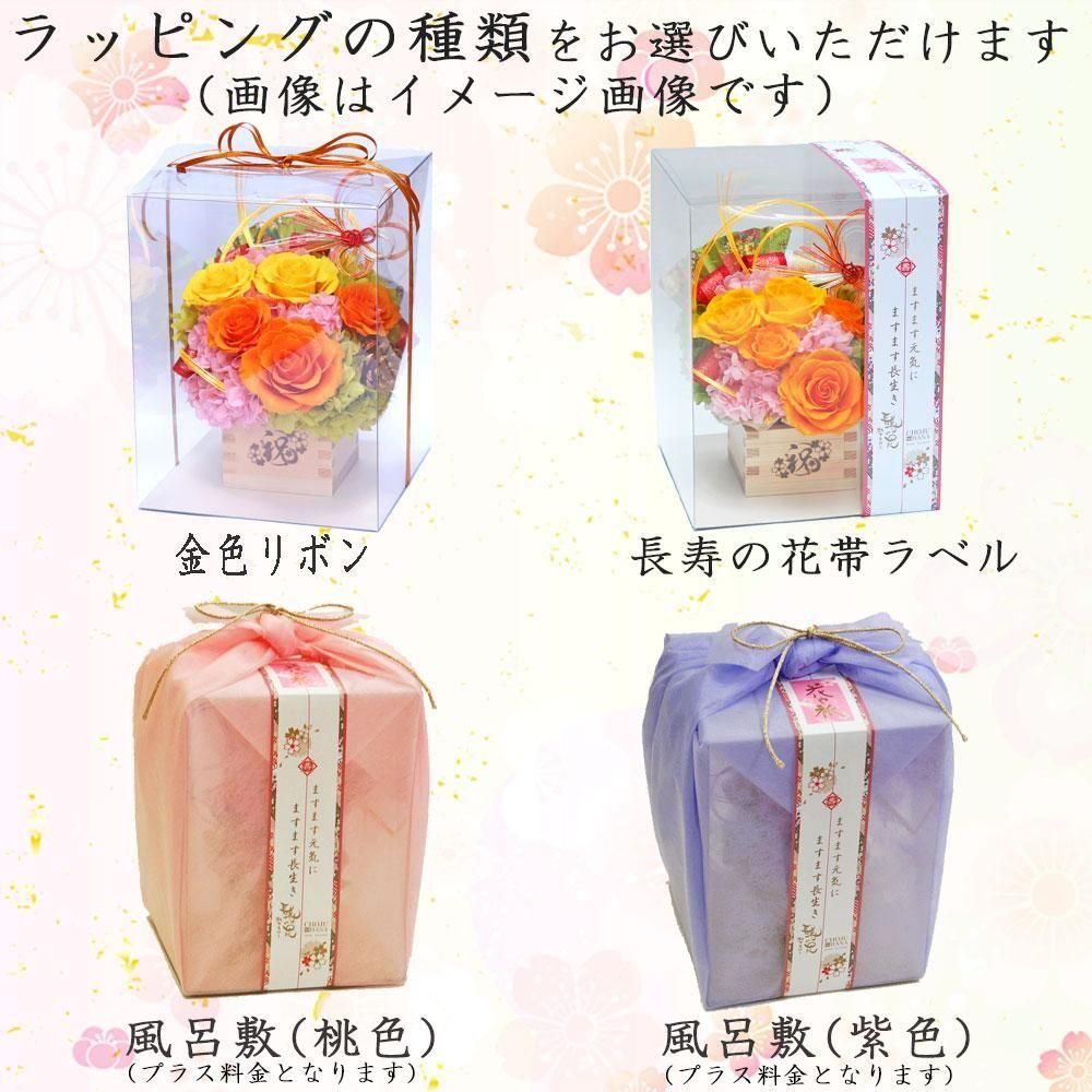 クリアケース入りのお花を、桃色の風呂敷(不織布製)と、長寿の花帯ラベル、金色の紐リボンでラッピングいたします。(+330円)